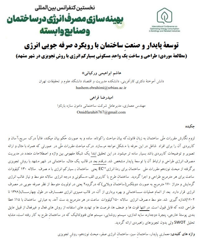 لزومِ نگارش مقررات ملّی ساختمان به زبانِ قانون،که بیان مباحث راکوتاه، ساده و به صورت حُکم بیان میکند، غالباً درک سریع،آسان و کاربردی آن را برای افراد شاغل در این حرفه با مشکل مواجه میسازد. درکِ مباحث مقررات ملّی در صورتی که همراه با مثال و ارائه تصویر و توضیحات کاربردی باشد بسیار ساده تر میشود. در این تحقیق ابتدا یک شبکۀ مفهومی بین واژه و اصطلاحات متعدد در مدیریت مصرف انرژی طراحی و ارتباط آن با توسعۀ پایدار مشخص شد. درقدم بعد در قالب یک مثال، ساختمانی در شهر مشهد با روشِ تجویزی برگرفته از مبحث نوزدهم مقررات ملی ساختمان برای ردۀ انرژیEC++ یعنی ساختمان بسیارکم انرژی با مصرف سالانه 130 کیلووات ساعت برای هر مترمربع طراحی و اجرا گردید. ساختمانِ طرح با کاربری الف-مسکونی و درجه انرژی سالانه متوسط و نیاز غالبِ انرژی گرمایش و متراژ 170 مترمربع به صورت دوبلکس(ساختمان ویلایی)که درگروه2 یعنی در اولویت متوسط از نظر صرفه جویی در مصرف انرژی قرار دارد. بعد از اتمام عملیات ساختمانی و بهره برداری از آن، در قالب ممیزی انرژی مصارف در طول چهارسال(1399 تا 1402)اندازه گیری شد. متوسط مصرف انرژی سالانه 150کیلووات ساعت در هر مترمربع بدست آمد. به عبارتی ساختمان با 15% خطا طراحی شده که قابل قبول است. در انتها قوت ها و ضعف ها، فرصت ها و تهدید های استفاده از روش های فعال و غیرفعال از قبیل عایق بندی پوستۀ خارجی، پنجرۀ دوجداره، سایه اندازی، سیستم روشنایی، سیستم های فتوولتائیک که در ساختمانِ طرح به کار رفته است، مشابه تحلیل SWOT ولی بدون تجویزهای راهبردی ارائه گردید.